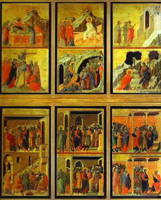 Duccio, siennois, est contemporain de Giotto qui travaillait autour de Florence et dont le cycle de la chapelle de l’Arena de Padoue (1305) inaugure d’une part le récit biblique par des panneaux cadrés, de grand format, d’autre part, la peinture à fresque à fond bleu, enfin une figuration réaliste des personnages qui a anticipé sur les recherches des peintres humanistes de la Renaissance.